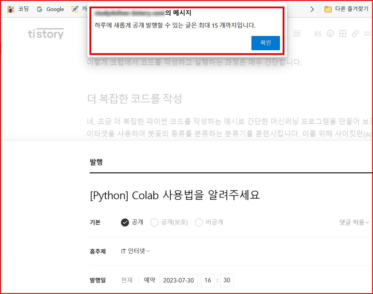 저장 갯수 제한은 '공개' 글이기 때문에 비공개나 보호된 글은 해당되지 않습니다. 제한 갯수가 초과되면 위와 같이 '하루에 새롭게 공개 발행할 수 있는 글은 최대 15개까지입니다'라는 알림 창이 뜹니다.