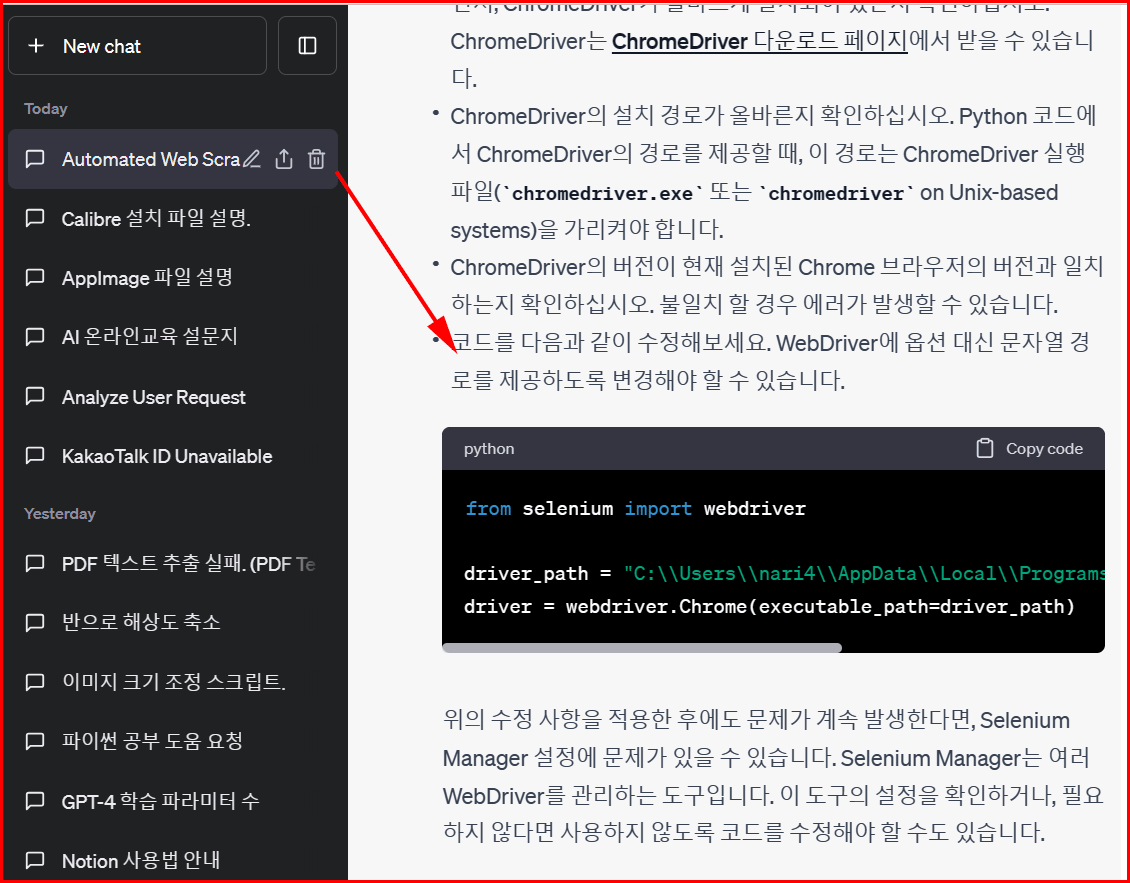 '파이썬 공부'를 어제에 이어 오늘 다시 하려면, 지난 채팅에서 '파이썬 공부 도움 요청'을 선택하고 진행하면 어제 채팅에서 나눴던 내용을 배경으로 대화가 이어지게 됩니다.