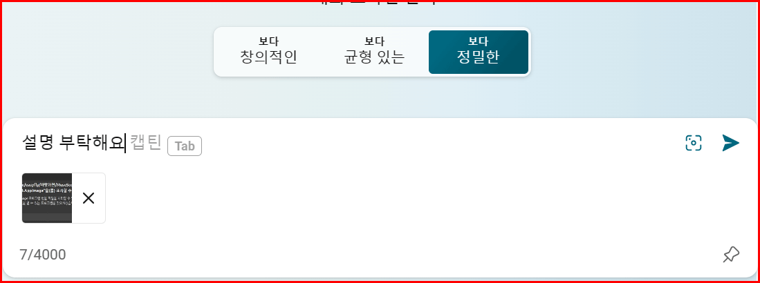 그리고 대화 스타일은 3종류로 '창의적인부터 정밀한' 스타일까지 격을 뒀군요. 아마 대화의 자유도에 차이가 있는 것 같습니다. 텍스트박스(대화창) 뒤쪽에는 카메라 아이콘과 마이크 아이콘이 있습니다.