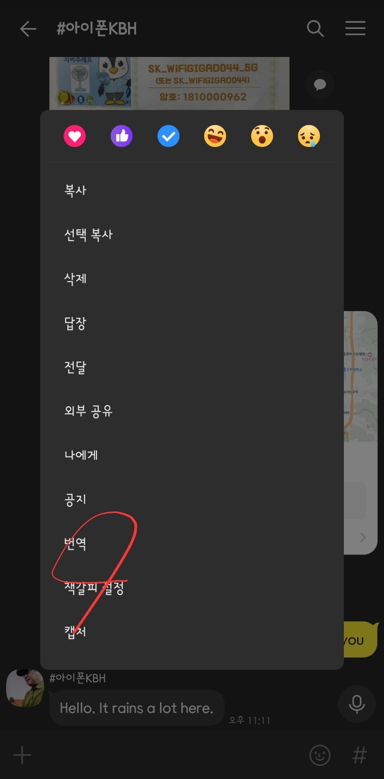 외국어로 카톡이 온 경우, 해당 말풍선을 길게 누릅니다. 나오는 메뉴에서 '번역'을 선택합니다.