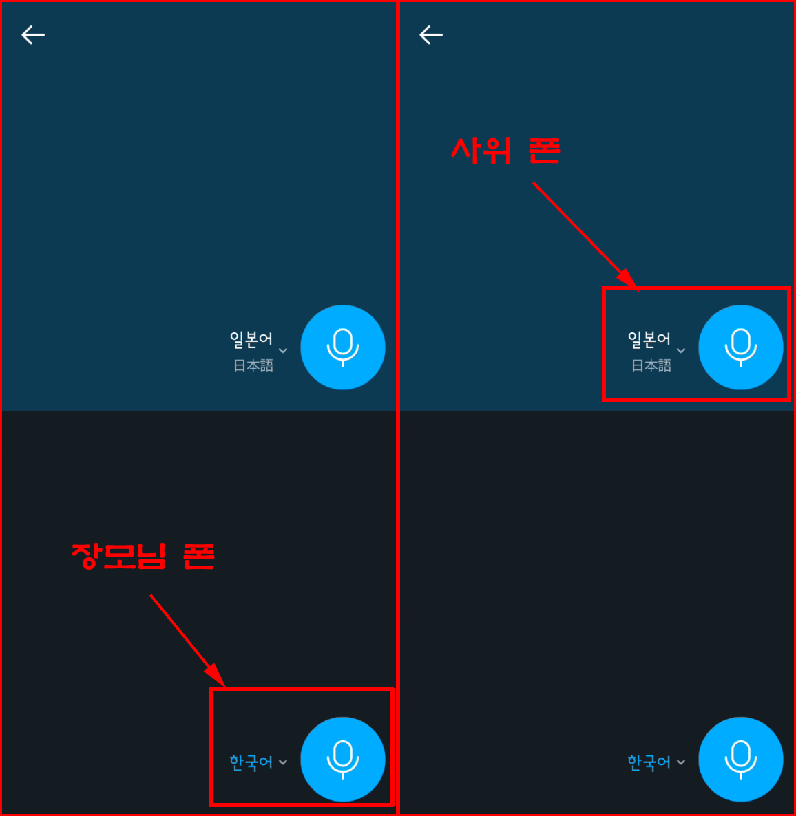 이런 사례가 가능할 것입니다. 이 경우는 영화 '헤어질 결심'의 사례보다 한 단계 올라선 경우입니다. 각자의 폰으로 통역을 시키는 것이기에 두 통역사를 고용하고 있는 셈입니다. 자신이 말할 차례에 마이크 버튼을 클릭하고 말을 하기 때문에 더 수월합니다.