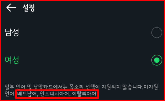 아직 성별 구분의 '발음 듣기 설정'이 지원되지 않는 국가는 베트남어, 인도네시아어와 이탈리아어입니다. 다른 국가는 발음 듣기 설정을 통해 더 어울리는 설정을 할 수 있습니다.