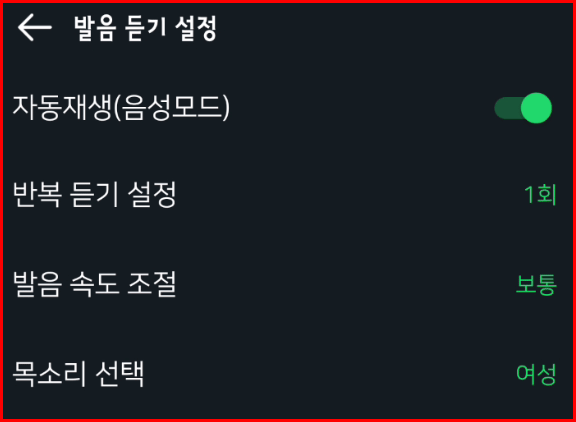 또한 발음 속도와 반복 듣기 등을 통해 효과적인 소통을 할 수 있습니다. 자동재생(음성모드)는 기본으로 선택된 경우가 편합니다.