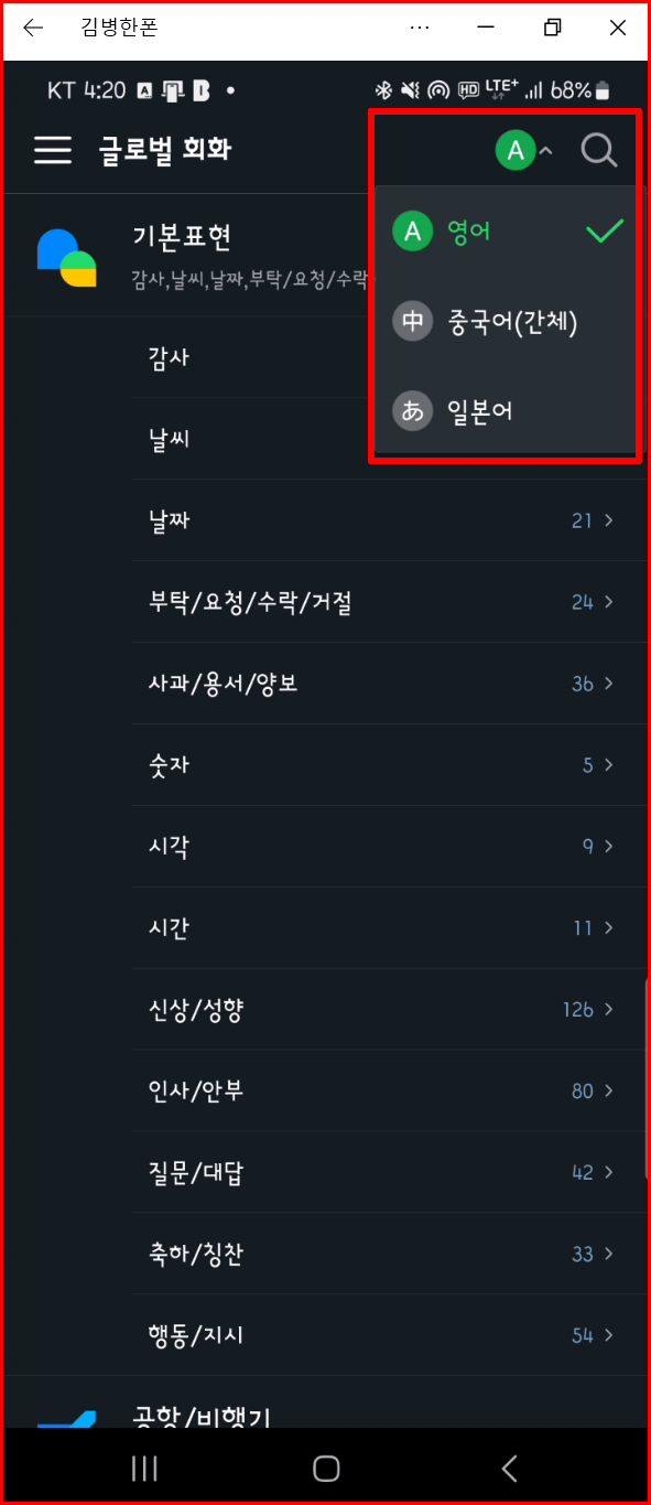 회화에 필요한 기본 표현을 비롯한 여러 범주에 걸쳐 리스트가 나옵니다. 지원되는 언어는 '영어', '중국어(간체)', '일본어'가 있습니다.