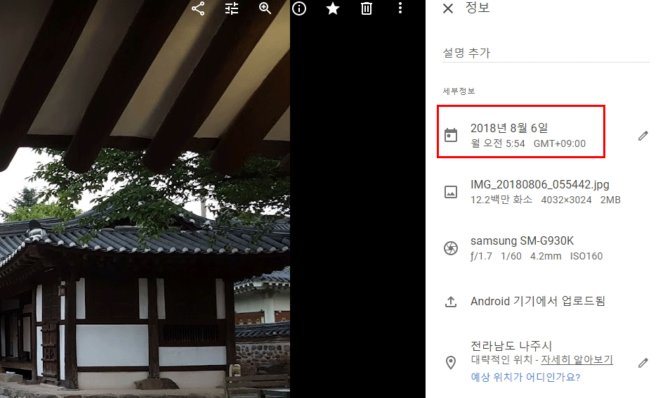 마당 가운데 싱그럽게 자라던 호두나무 한 그루. 그 나무가 없어진 나주목사내아는 뭔가 빠진 듯이 허전하게 보였습니다. 구글포토는 모바일 앱도 있습니다. 모바일에서는 이 사진을 찾지 못했습니다. 데스크탑과 모바일이 조금 다르게 사진이 배치되어 있나 싶은데, 그 이유는 아직 찾지 못했습니다. 위 사진의 정보는 메타정보를 통해 그날 아침에 촬영한 것을 알 수 있습니다. 목사내아에서 잠을 자고 새벽에 나주시 일원을 답사했거든요.