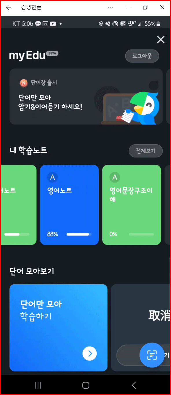 '암기하기'를 눌러 어려운 단어 공부도 빠르게 학습할 수 있습니다. 암기 현황 및 노트 리스트는 에듀 홈에서 확인할 수 있습니다. 정리한 단어를 외우는 것도 간단하게 학습할 수 있습니다. 그동안 단어 가리고, 뜻 가리고 등의 방법이 아닌 새로운 방법을 써 보세요.