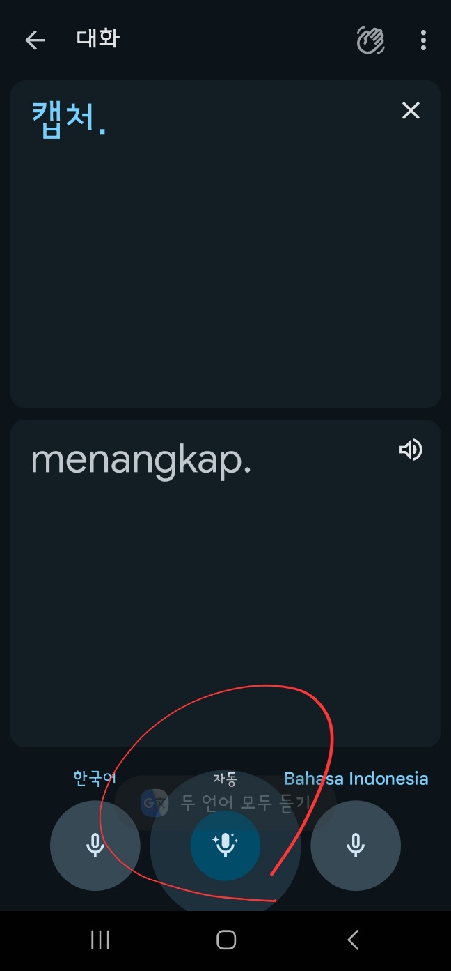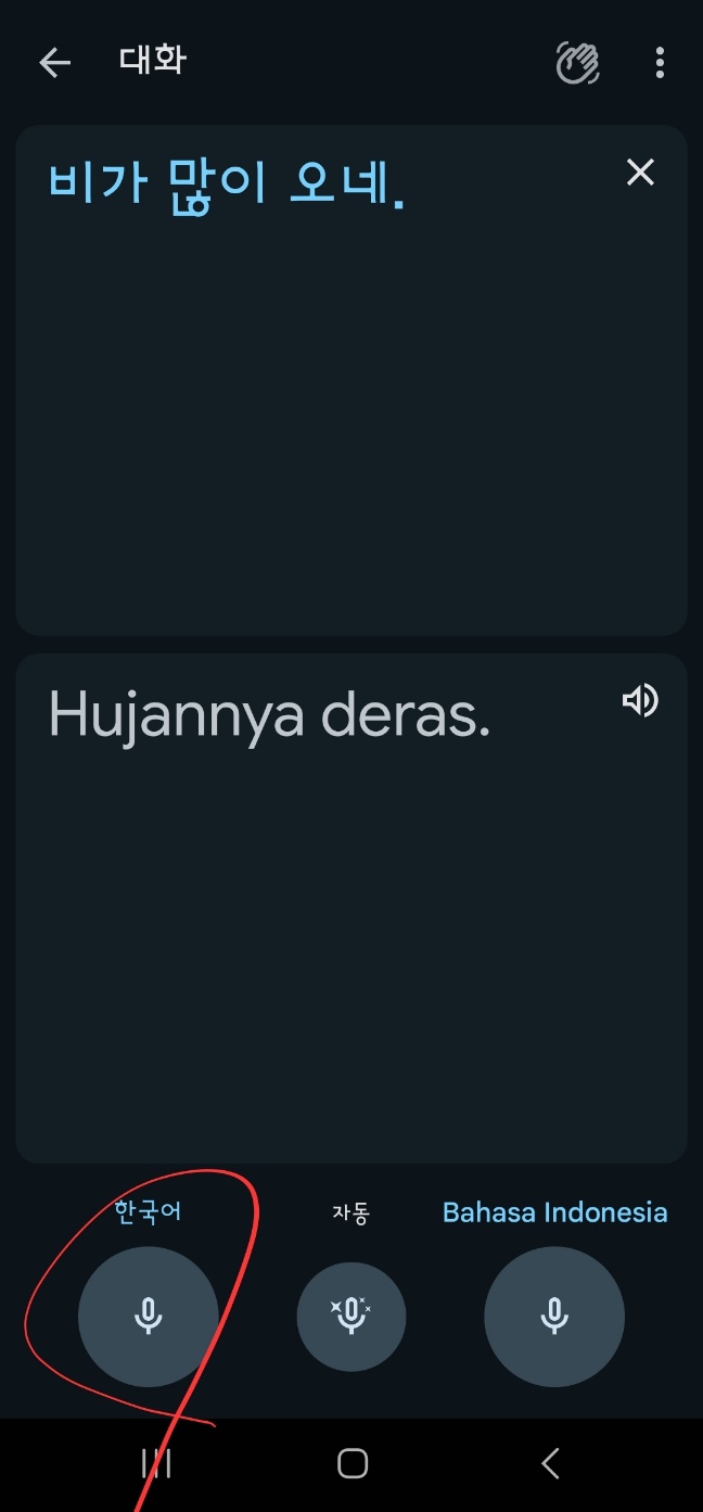 두 언어를 모두 들으면서 '구글 통번역'은 진행됩니다. 위 경우는 '한국어'와 '인도네시아어' 사이의 통번역 경우입니다.