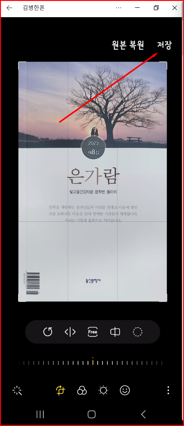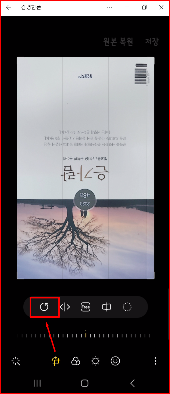 책 표지를 사진을 찍어 올렸는데, 이미지가 거꾸로 올라갔다고 하셨습니다. 아마 촬영할 때 폰이 뒤집힌 상태에서 촬영하지 않았을까 추측이 됩니다. 스마트폰에서 사진을 보정할 수 있는 기능이 있기에 폰에서 바로 고칠 수 있습니다.