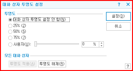 기본은 '투명도 설정 안 함'입니다. 그것을 75%까지 올렸으니 지평선에 올라오는 아지랑이처럼 희미하게 아른거려 확인할 길이 없습니다.