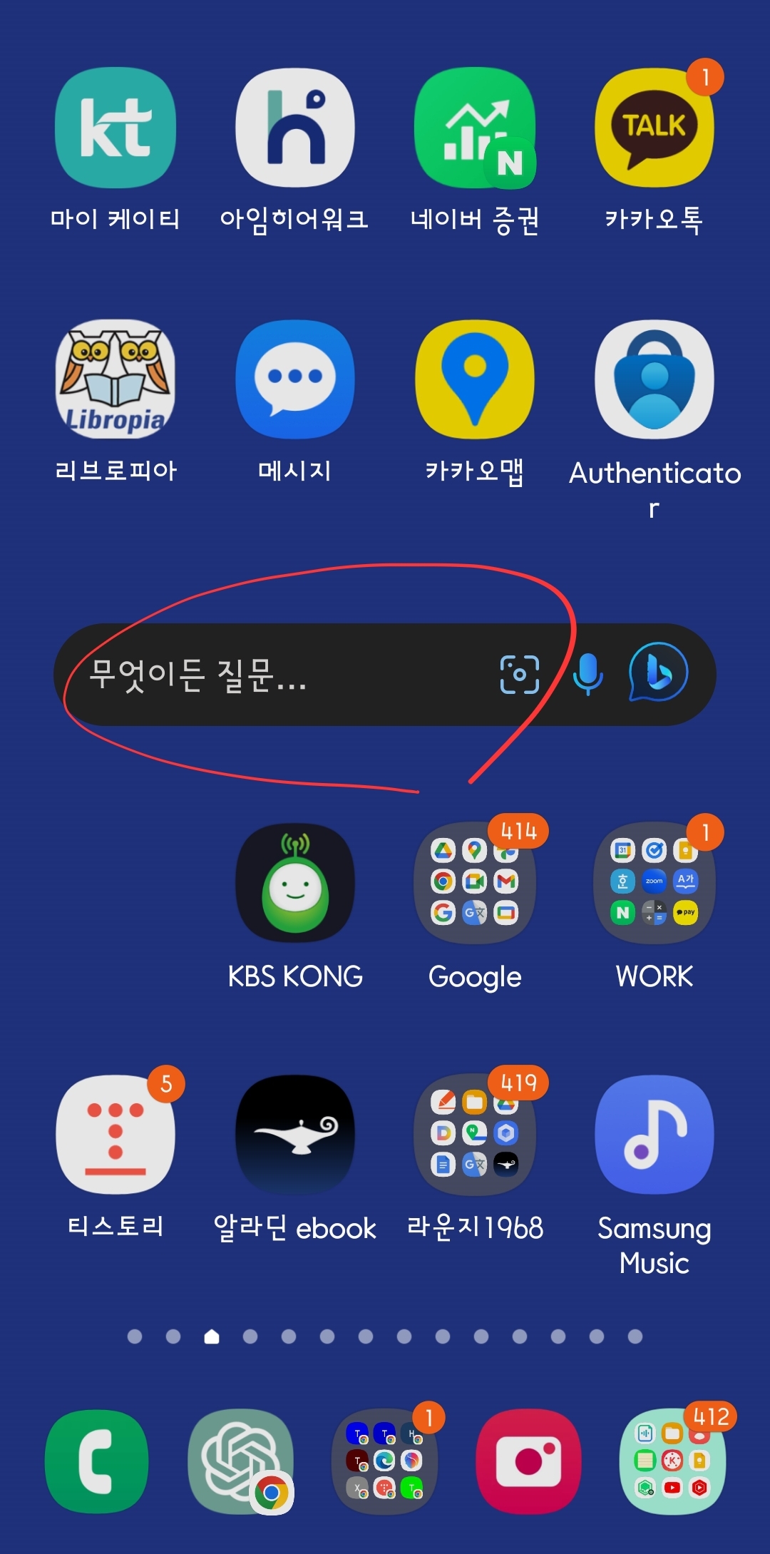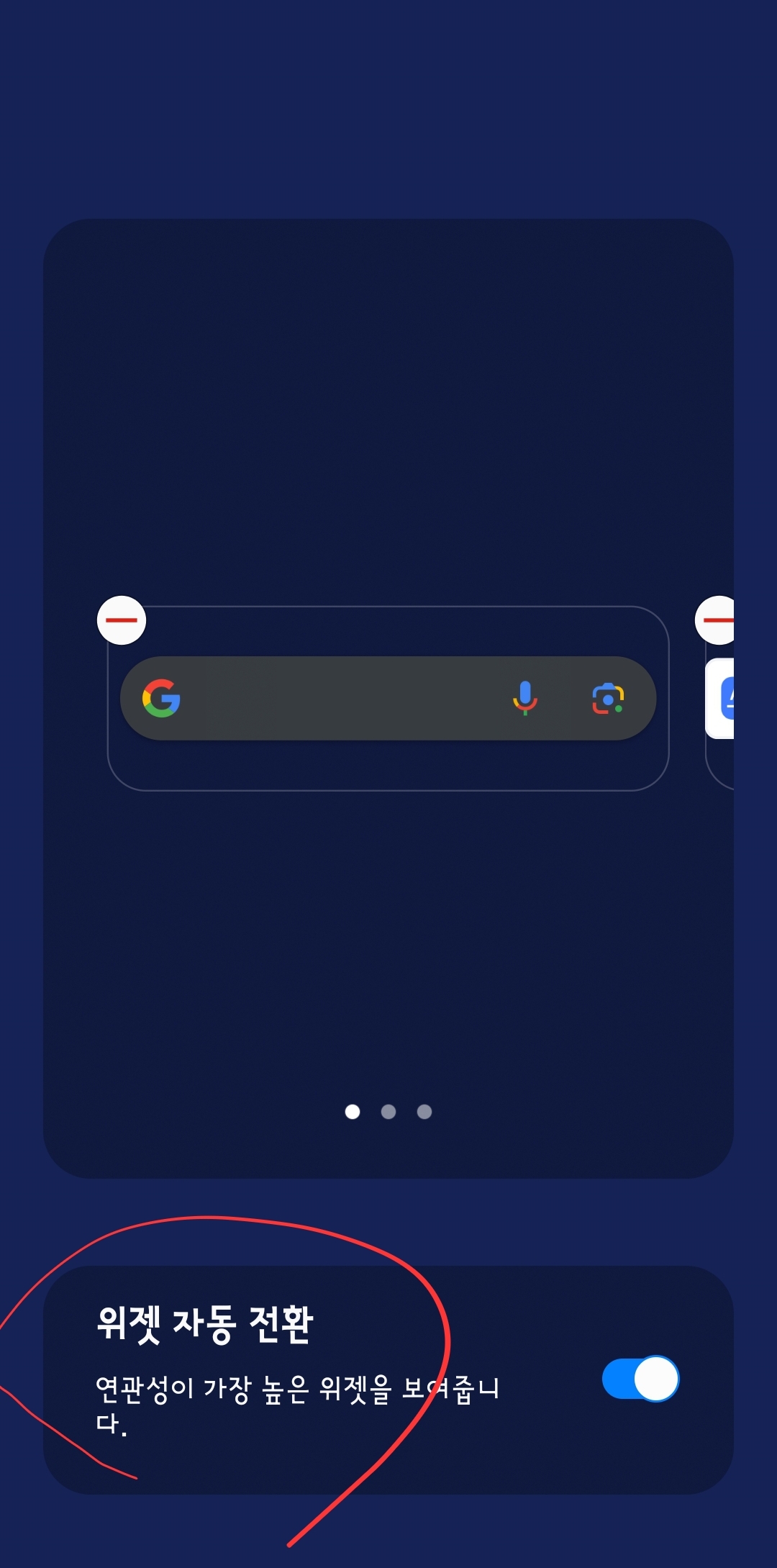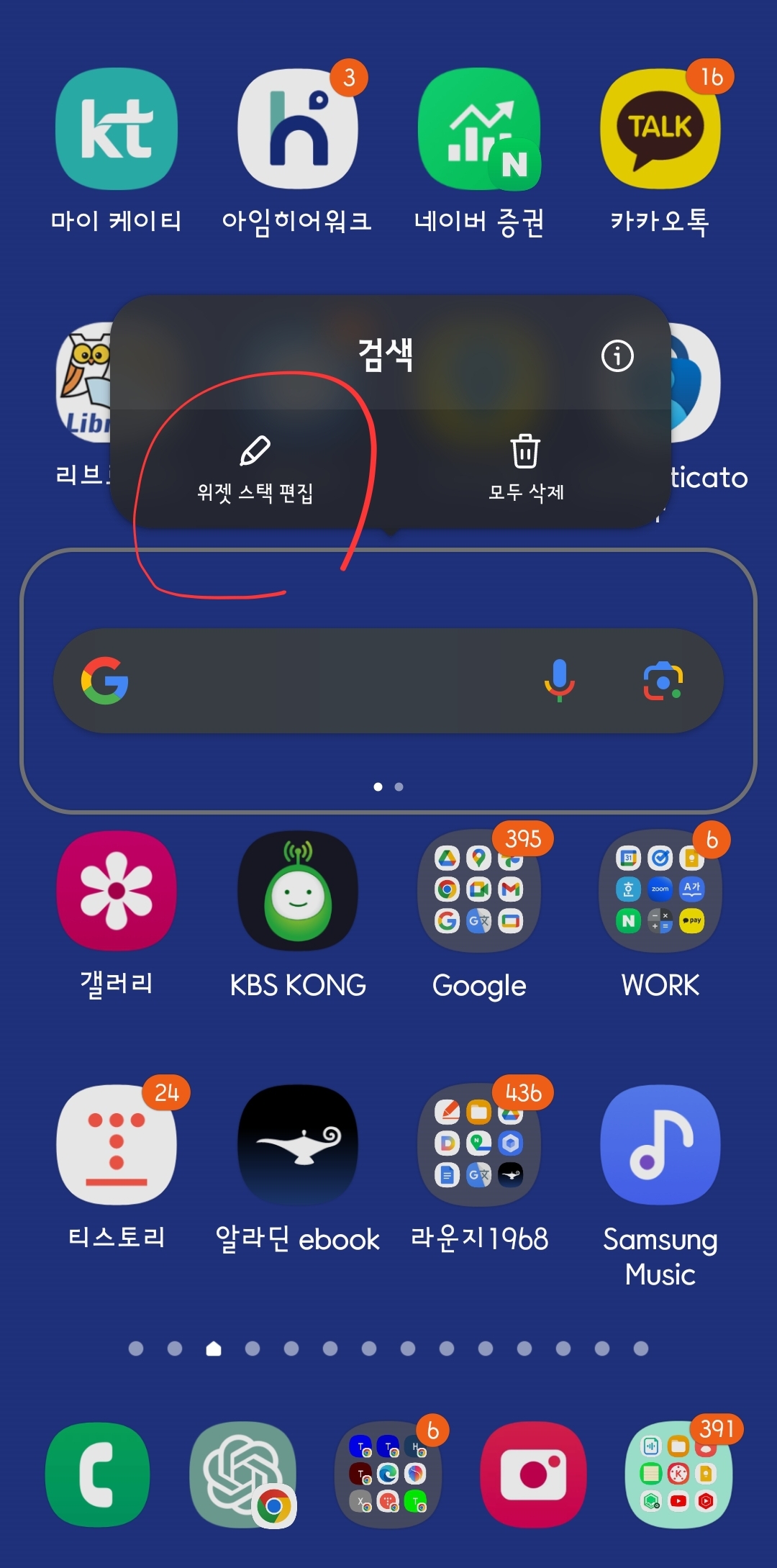 '위젯 스택'은 위젯을 겹쳐 사용하는 것입니다. 홈화면 가운데에 검색 위젯 셋을 겹쳐 스택으로 설치했습니다. 설치된 '위젯'을 길게 눌러 나온 메뉴 '위젯 편집 스택'을 선택합니다.