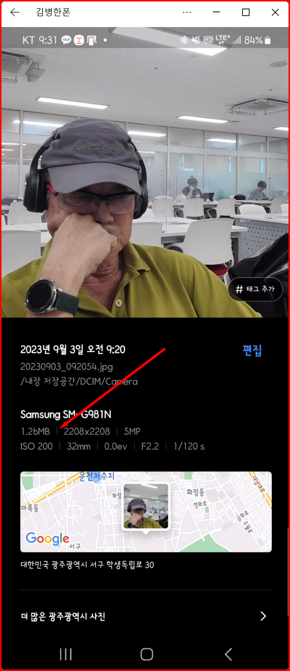 원본 사진과 내려받은 파일의 용량을 비교하겠습니다. 먼저 원본 사진은 용량이 1.26MB이군요. 용량을 확인하는 방법은 파일의 '상세 정보'로도 가능하고, 사진을 위로 스크롤해서 나오는 정보로도 가능합니다.