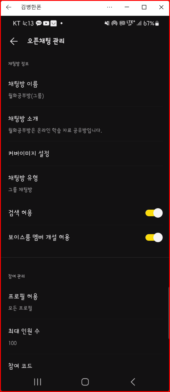 - 채팅방의 참여 방식(누구나 참여, 링크를 통한 참여 등)을 설정합니다.