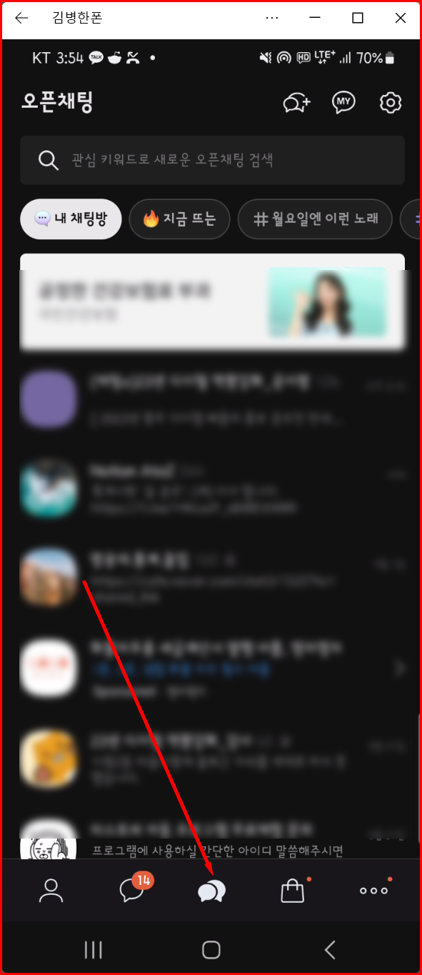 - 카카오톡 앱을 실행한 후, '채팅' 탭에서 '오픈채팅'을 선택합니다.