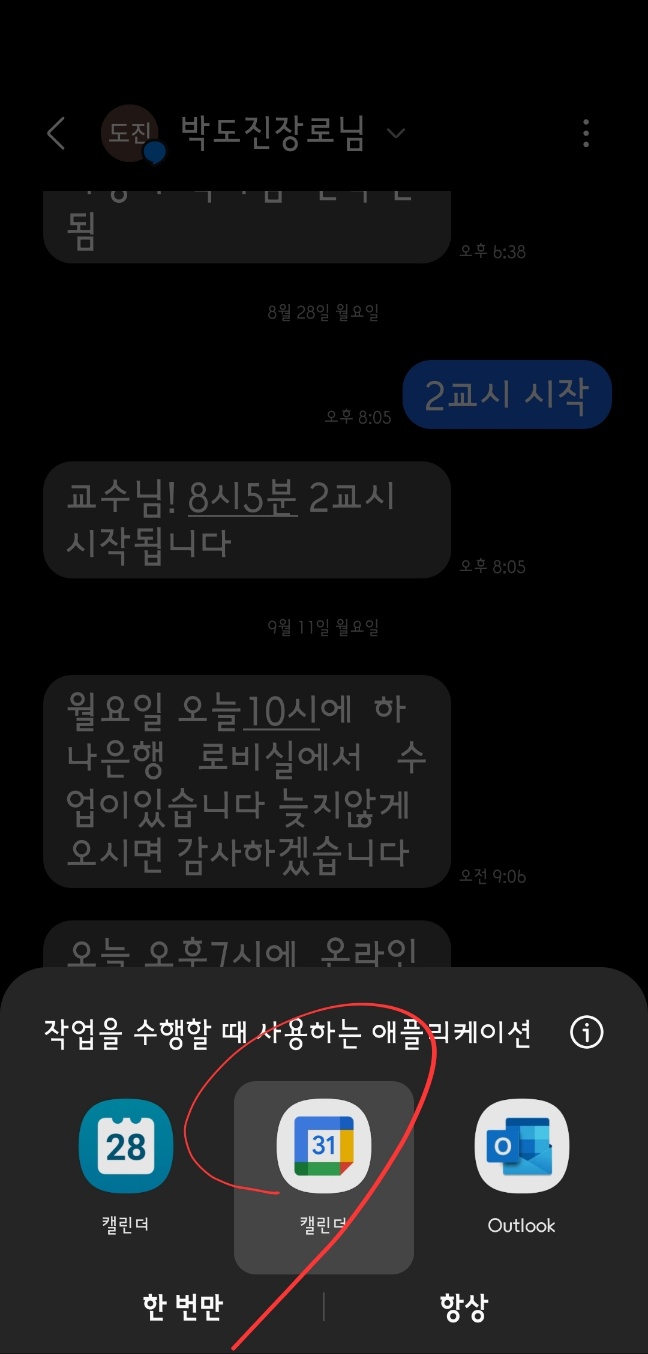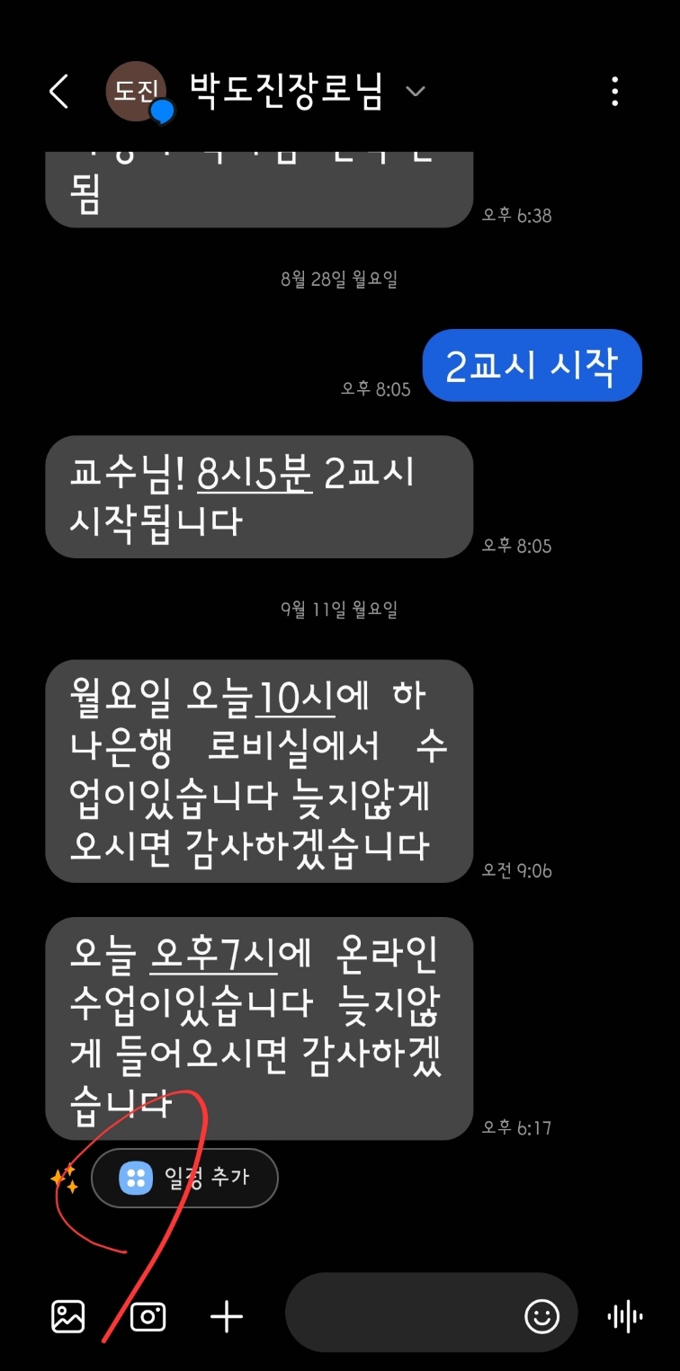 장로님이 알려왔습니다. 오후 7시 온라인 수업이 있다고. 역시 믿고 사용할 수 있는 메시지를 이용했습니다.