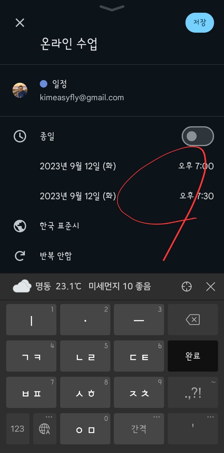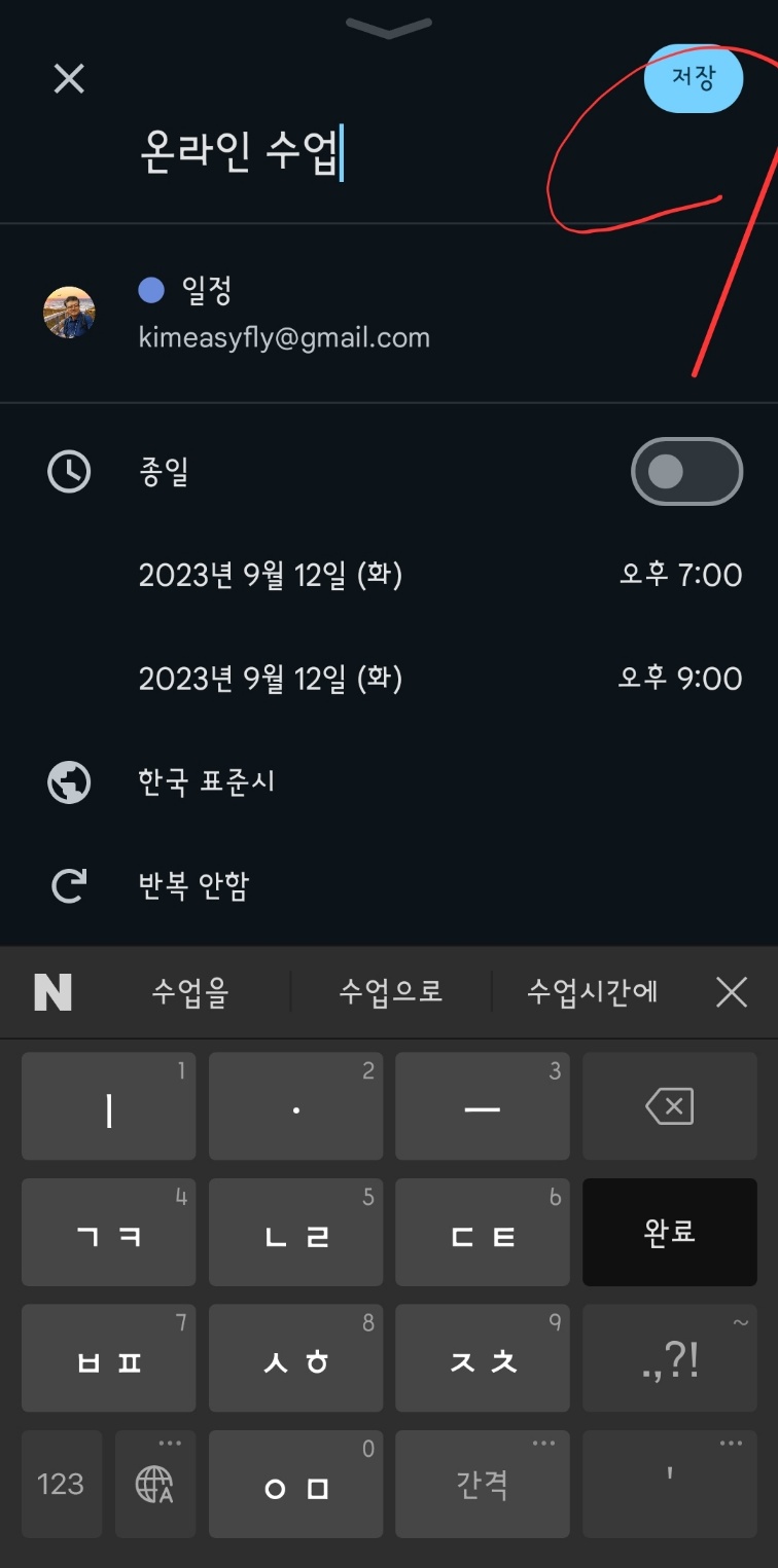 최종적으로 '저장'합니다. 만약 반복되는 일정이라면(예를 들어 생일) '반복' 여부를 선택하여 반복 조건을 결정합니다.