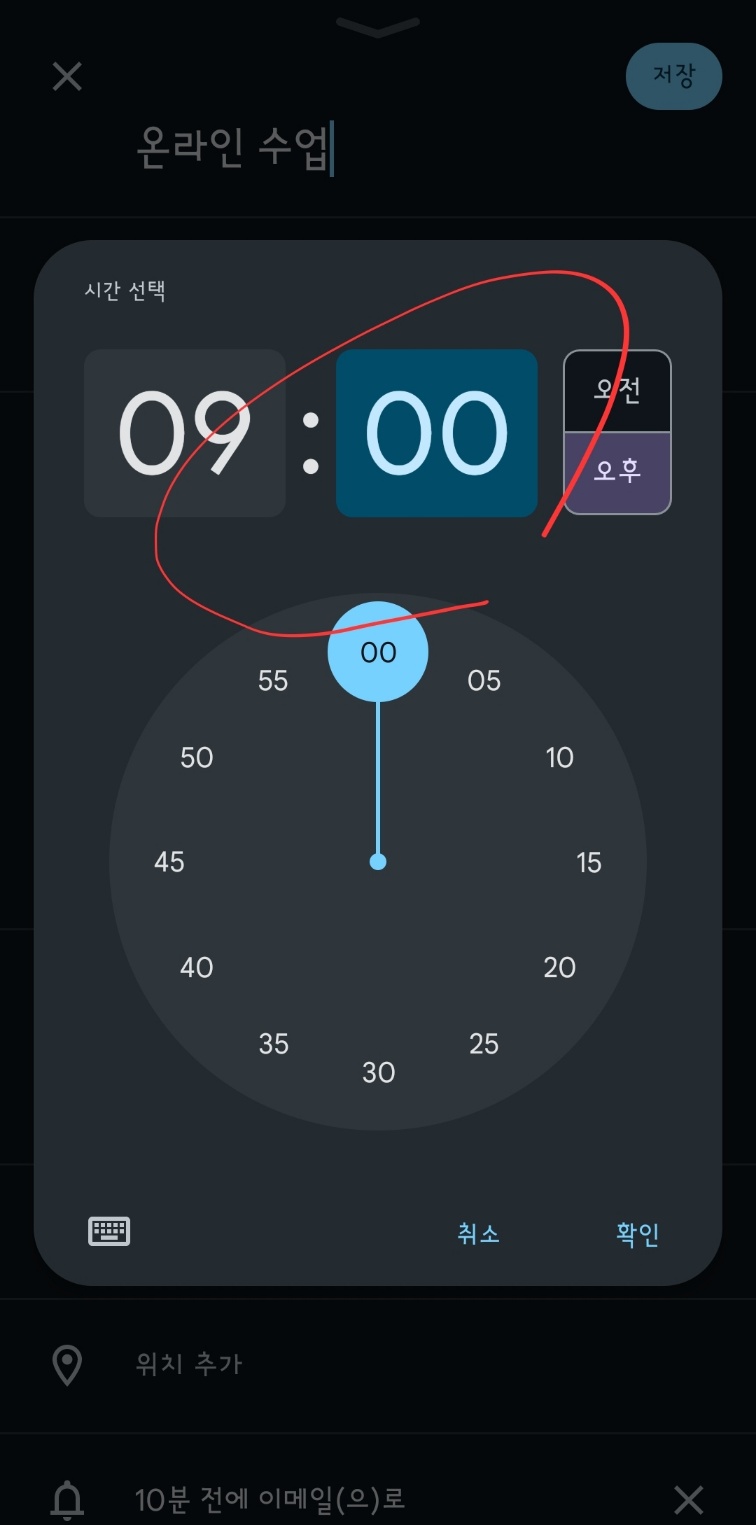 시계의 해당 부분(오후, 9시)을 결정하고 '확인' 버튼을 누릅니다.