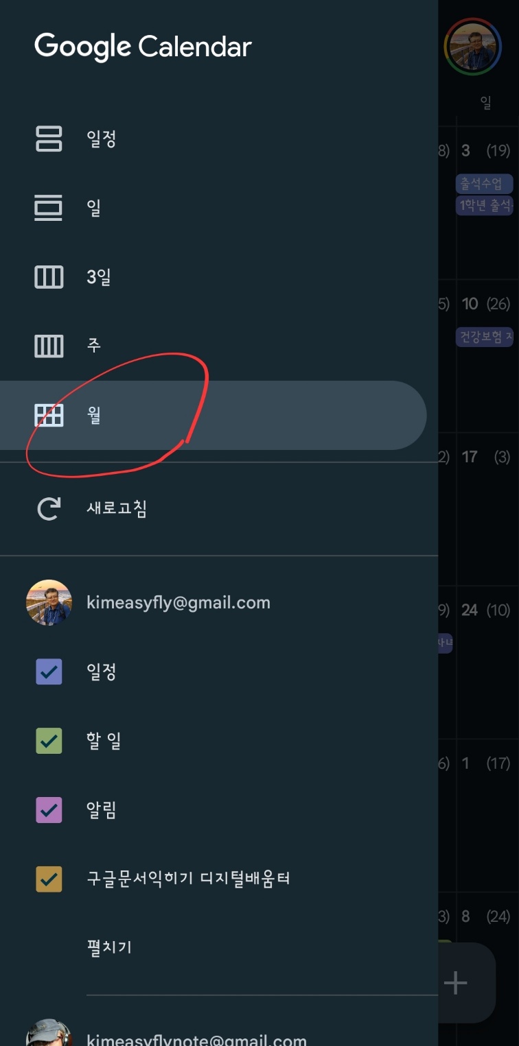캘린더 좌상단 '세 줄 더보기'를 선택한 화면입니다. '월' 단위로 확인하고 마치겠습니다. 나타난 여러 메뉴 중 '월'을 선택합니다.