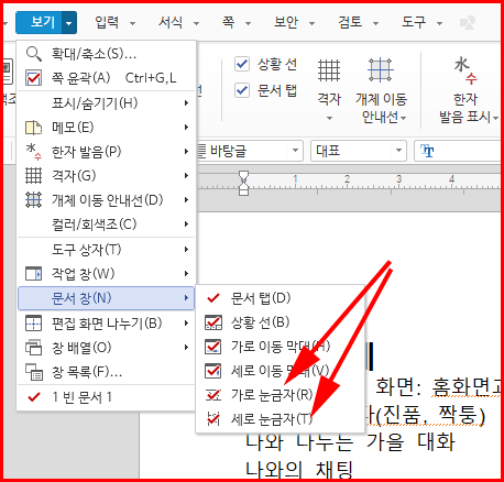 편집창에 눈금자를 보이려면 '보기 > 문서 창'에서 선택 여부를 정합니다. '문서 창'에는 그 외에도 여러 가지 요소를 선택/해제할 수 있습니다.