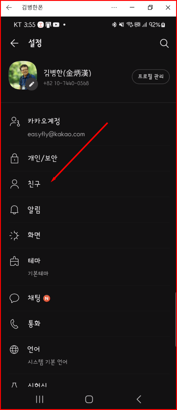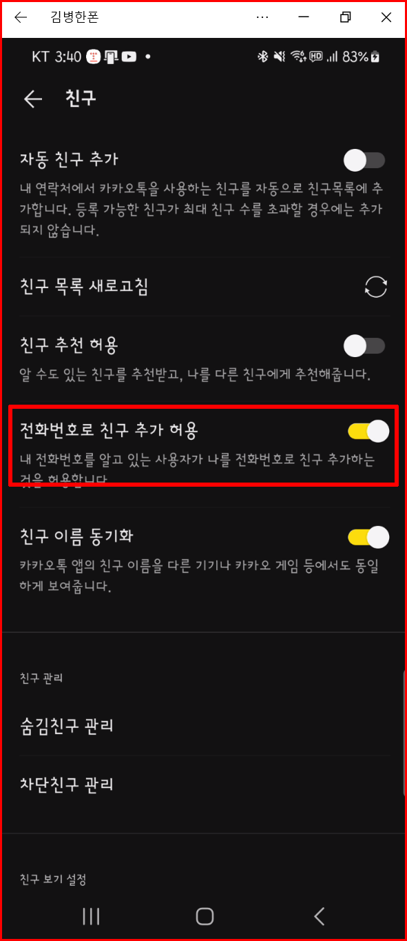 카카오톡 친구 관리에 모든 것이 이곳에 있습니다. 그 가운데 하나가 '전화번호로 친구 추가 허용'입니다. 다른 내용은 다른 포스트에서 얘기됐기에 여기서는 생략하겠습니다.