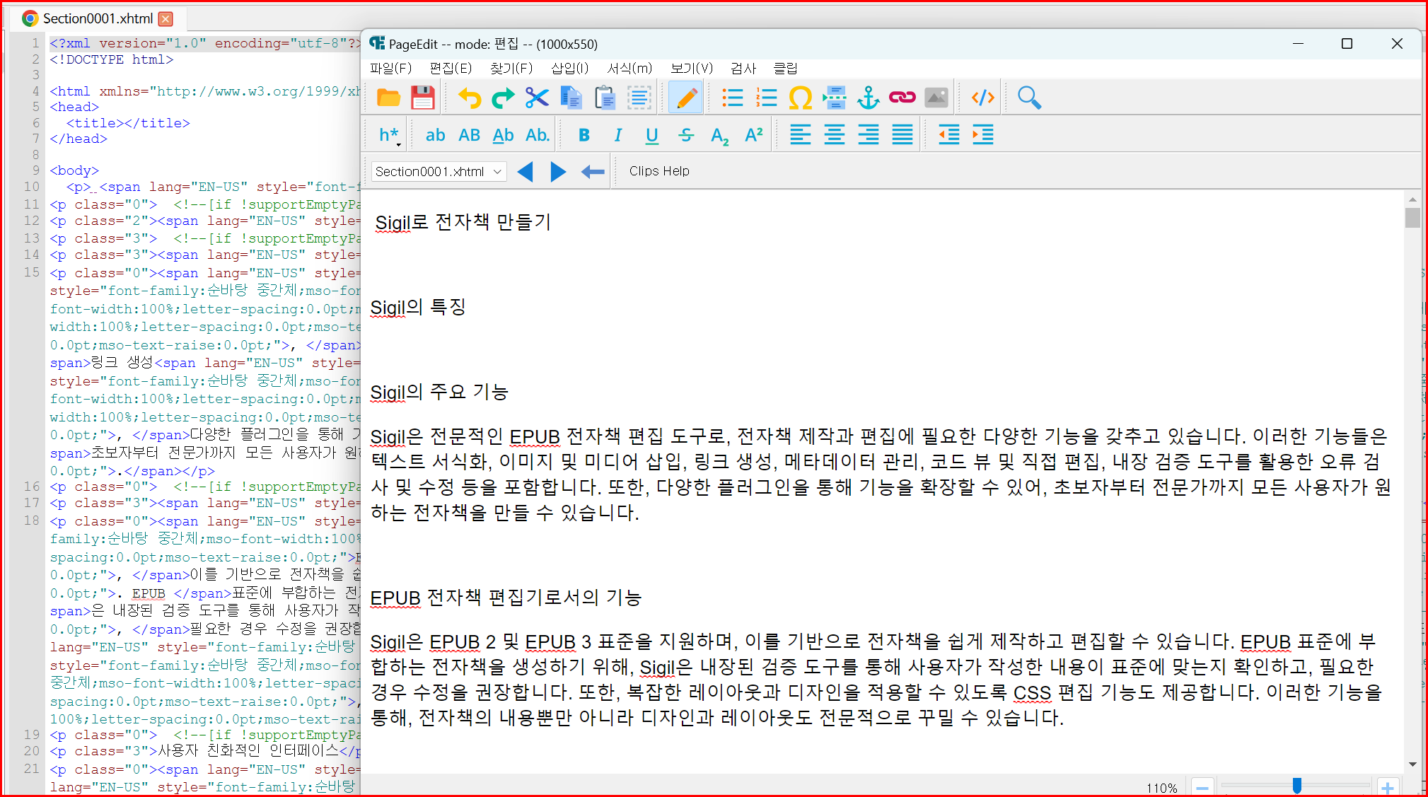 Sigil로 전자책을 만들기 위해 'Sigil'과 'PageEdit'를 설치했습니다. 시길로 전자책을 바로 편집하는 것이 불편하기 때문에 도우미 역할을 하는 편집기인 페이지에디트도 설정을 통해 연결했습니다. 시길로 작성해야 할 'XHTML'을 편집기를 통해 쉽게 연결하여 사용상의 복잡함을 줄였다는 얘기입니다. 사용은 편리하지만 절차는 복잡해졌습니다.