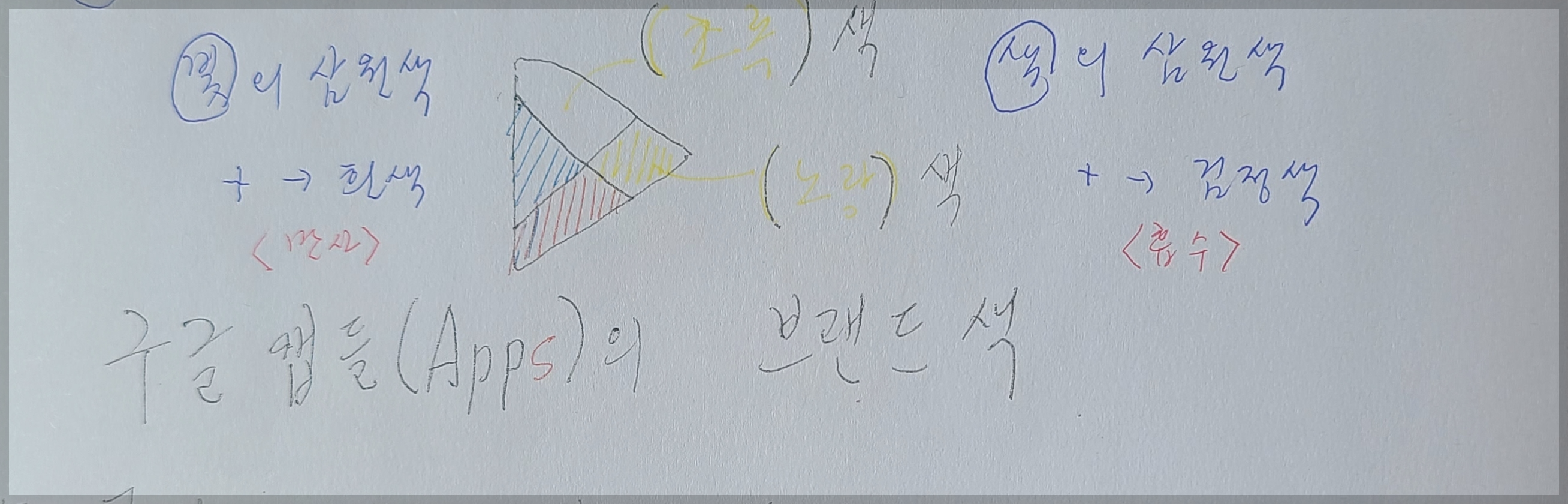 번역 앱과 유튜브 앱을 제외하면 대부분 4색으로 아이콘을 만들었습니다. 이것으로 빛의 3원색과 색의 3원색을 이해하는데 도움이 되는 학습지를 아래와 같이 만들었습니다. 구글의 브랜드색이 어떻게 이뤄졌는지를 발견하는 일을 시작한 것이죠. 또한 구글 플레이스토어를 통해 어플을 설치하는 것을 배울 단계거든요.