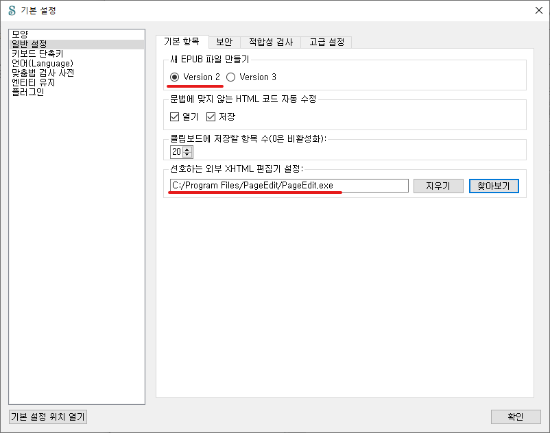 'EPUB 버전 2'와 'EPUB 버전 3' 중에서 이번 학습에는 'EPUB 버전 2'를 기준으로 진행됩니다. 일반 설정의 버전은 그대로 둡니다. 또한 맞춤법 검사는 아래한글에서 1차 검사를 마치고 불러오도록 합니다. 플러그인도 이번 과정에서 생략하고 기본적인 환경에서 진행됩니다.