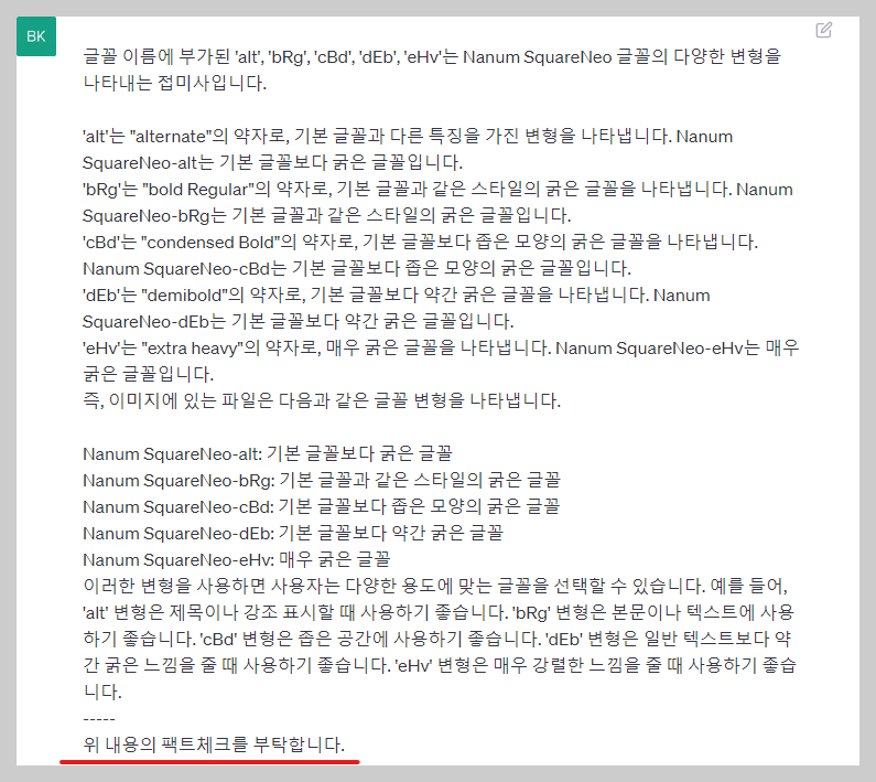구글 바드에게서 받은 네이버 나눔 폰트 정보를 오픈AI의 챗GPT에서 팩트체크를 했습니다. 팩트체크할 내용은 다음과 같습니다.