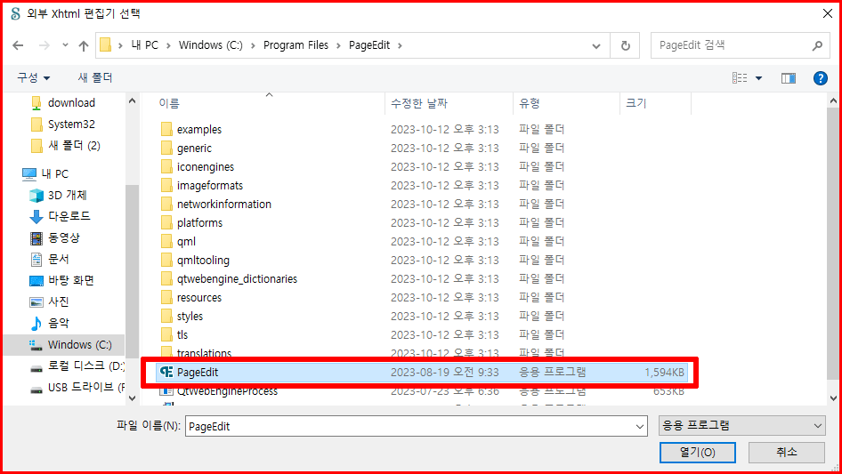 편집기 경로는 '모든 사용자' 용으로 설치한 경우는 'Frgram Files'의 'PageEdit' 폴더 안의 'PageEdit.exe'입니다.