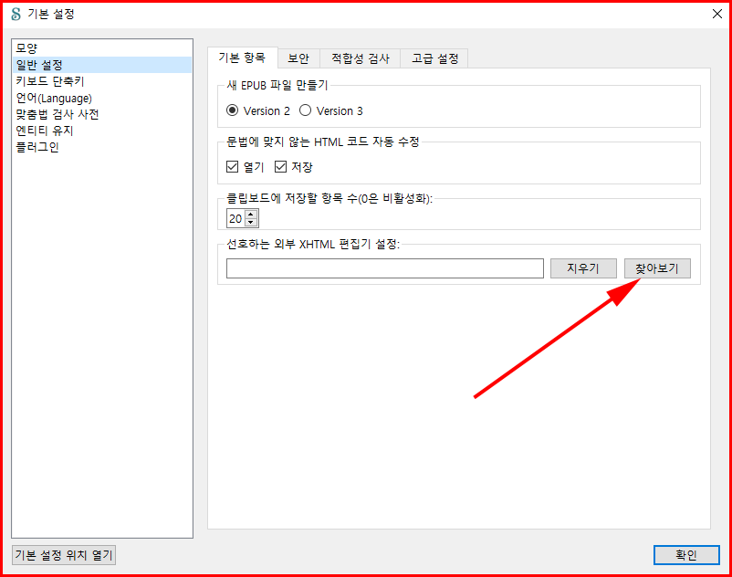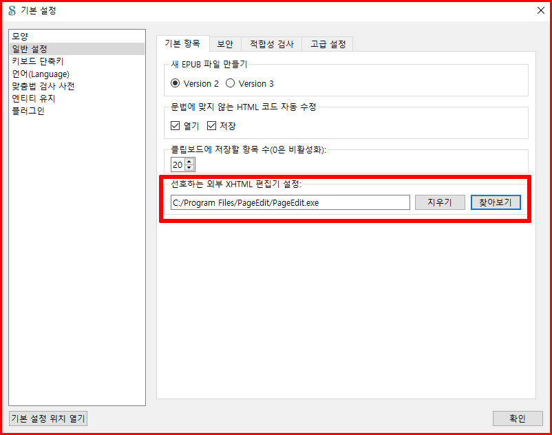 일반 설정에서 'Version 2'를 선택합니다. 중요한 설정은 편집기 경로를 잡아주는 일입니다. 일반 설정 제일 아래 '선호하는 외부 XHTML 편집기 설정'에서 시길과 같이 설치한 '페이지 에디트' 경로를 찾아 맞춰 줍니다.