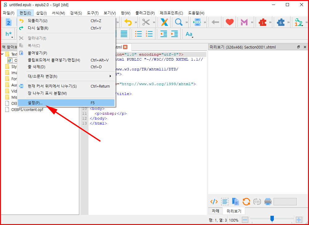 시길과 페이지 에디트를 설치합니다. 설치 후에 먼저'편집' 메뉴의 '설정'에 들어갑니다. 단축키는 'F5'입니다.