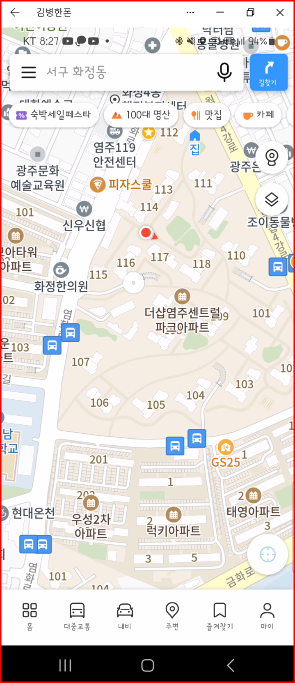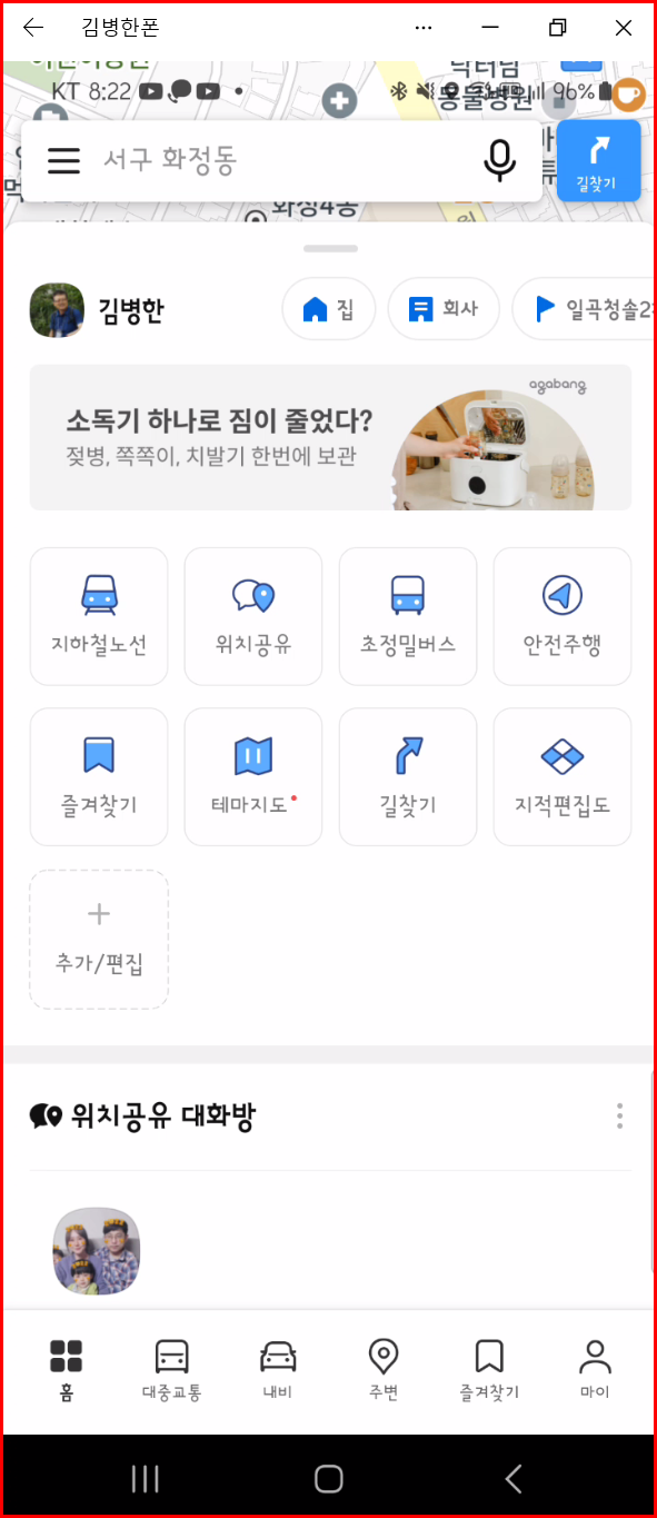 카카오맵을 실행하면 아래와 같은 화면이 나옵니다. 아래 '홈'을 비롯한 6개의 아이콘이 배치된 화면이 기본 화면입니다. 화면 중간에는 '창 조절점'이 있습니다. 이곳을 손가락으로 지긋이 누르고 위로 또는 아래로 조작하면 화면이 달라집니다. 연습이 필요한 동작입니다.