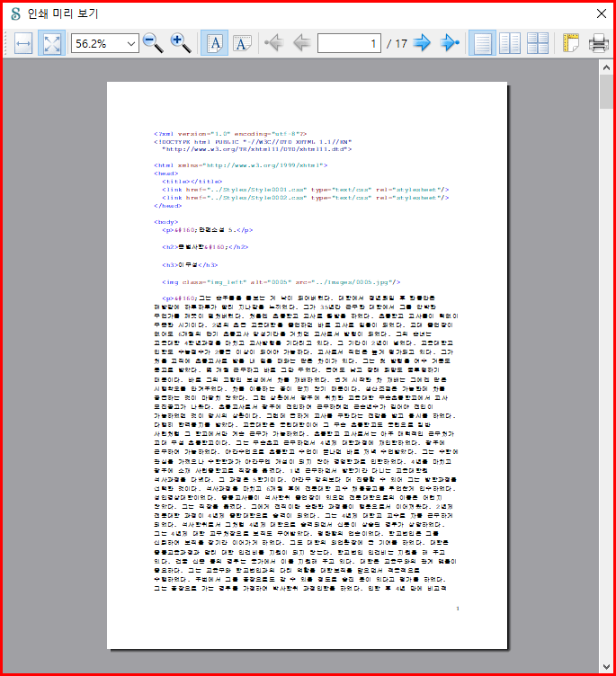 '미리보기' 창 아래에 있는 아이콘 들 중에서 '프린터' 아이콘을 선택합니다. 이 경우는 비교적 출판된 서적과 비슷한 모습의 형태로 출력됩니다.