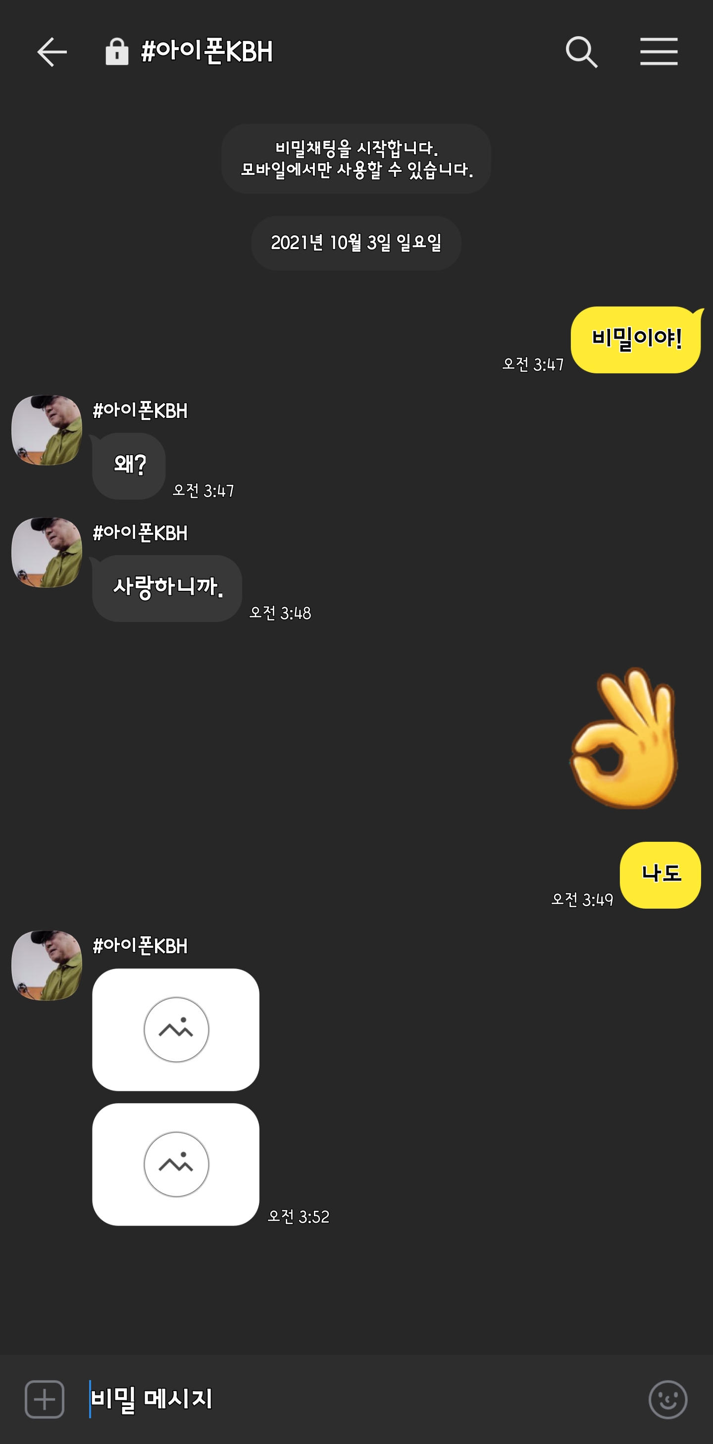 일반채팅방과 달리 비밀채팅방은 이미지를 보여주는 방식이 다르군요. 직접 보여주는 일반채팅방과 달리 비밀채팅방의 이미지는 보호해 주는군요.
