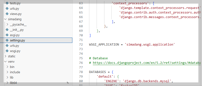 Django의 데이터베이스 연결 설정은 settings.py 파일에 정의되어 있습니다. 해당 파일을 열고 DATABASES 항목을 찾아보세요.