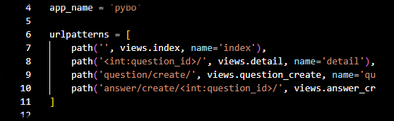 - 앱 이름까지 붙여서 url 'pybo:detail'처럼 네임스페이스(namespace)를 지정하면 앱 간 이름 충돌을 방지할 수 있습니다.