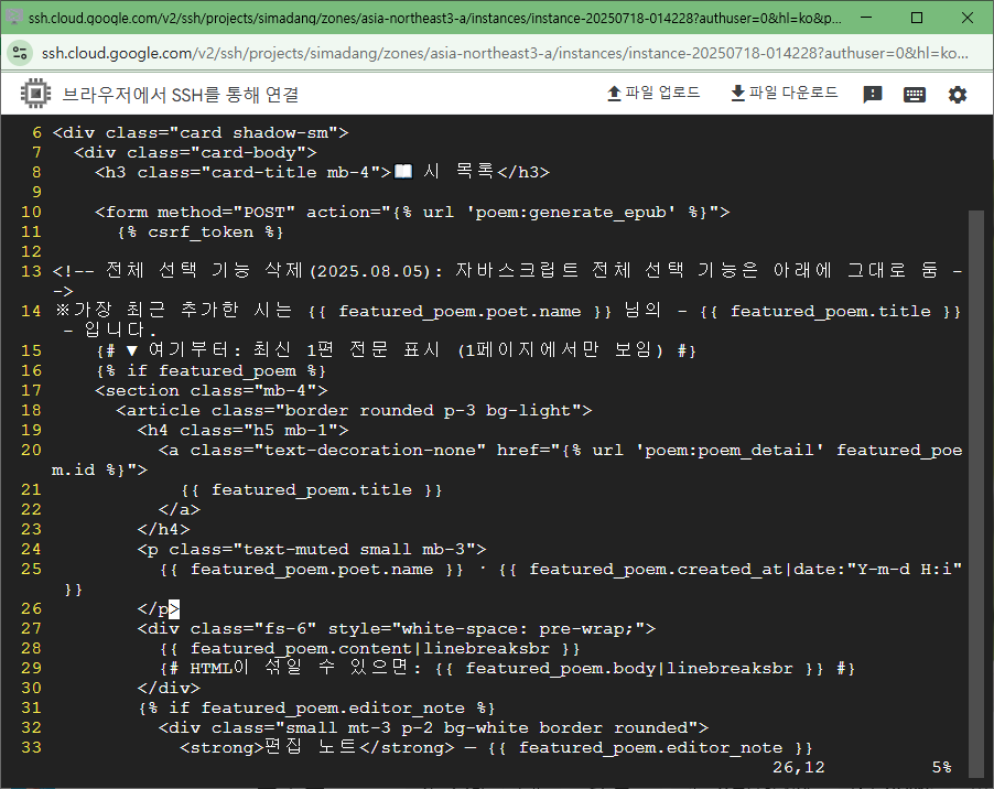 정리하면, CSS의 공백 보존을 끄고(pre-wrap 제거), 줄바꿈만 템플릿 필터로 HTML 태그화했기 때문에 첫 줄 들여쓰기는 사라지고, 시의 줄 나눔은 그대로 살아난 것입니다. 이 방법은 '오유권문학관' 프로젝트 원작 본문 표기에도 적용했던 것이었습니다.