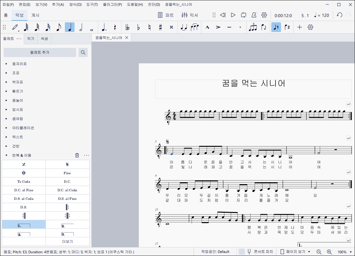 - 가사 2절, 3절처럼 여러 줄을 넣으려면, 같은 음표에 커서를 두고 Ctrl + ↓ (아래 화살표)를 누르면 다음 줄에 입력할 수 있습니다.