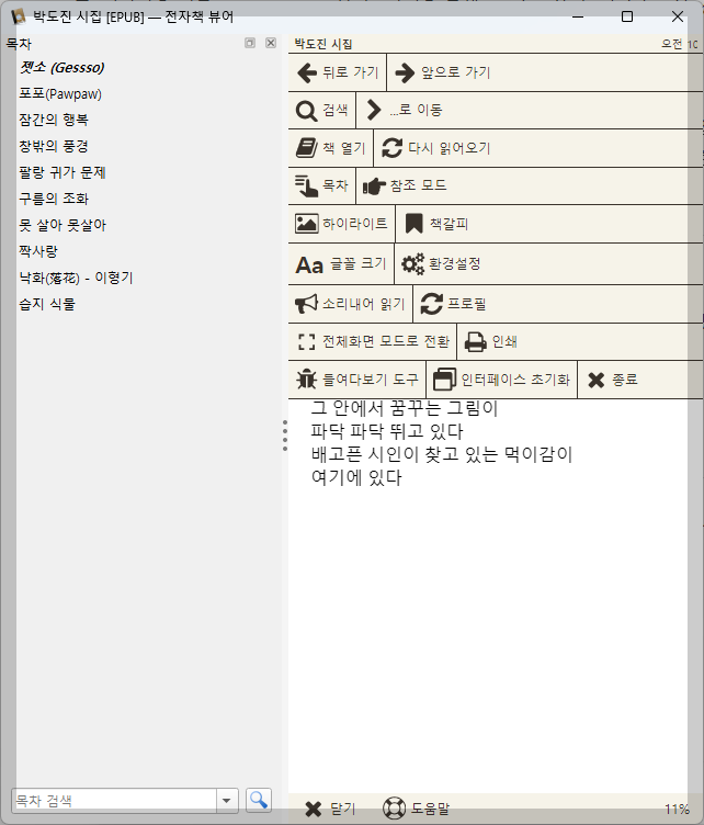 창은 사용자 편의에 따라 설정해서 사용하거나 마우스로 창의 크기를 변경해서 활용합니다. 다음은 전자책 '박도진 시집'을 목차와 함께 사용하는 모습입니다. 목차를 없애고 본문만 보려면 목차 우상단의 'x' 표시를 누르면 됩니다.