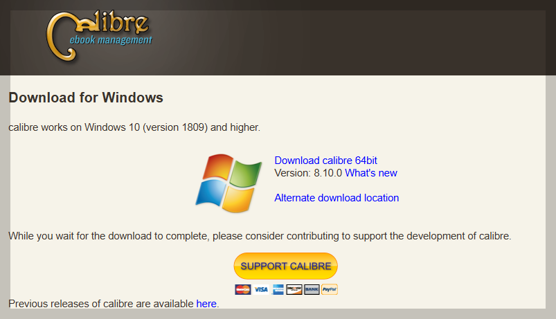 데스크톱용 캘리버는 캘리버 웹사이트에서 내려받을 수 있습니다. 주소는 calibre-ebook.com 입니다. 이곳에서 'Download calibre 64bit'를 클릭하면 바로 다운로드가 시작됩니다. 'msi' 포맷의 설치 파일이기 때문에 설치 과정은 비교적 간단합니다.