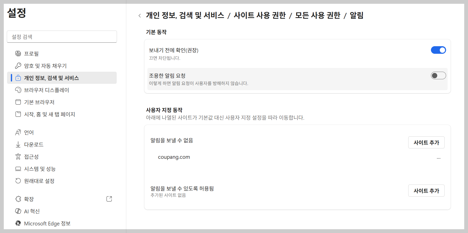 → 이 상태면, 새로운 사이트가 알림을 보내려 할 때 허용 여부를 직접 선택할 수 있습니다. - 조용한 알림 요청을 켜면, 알림 허용 창이 눈에 잘 띄지 않게 표시되어 성가신 팝업이 줄어듭니다.