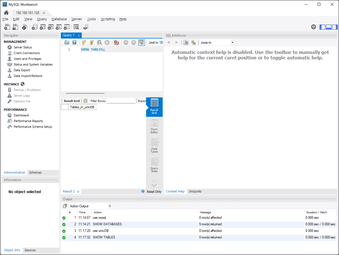 이럴 때는 명령행에서 mysql 명령어로 복원할 수도 있습니다. - mysql -u root -p univDB < backup.sql