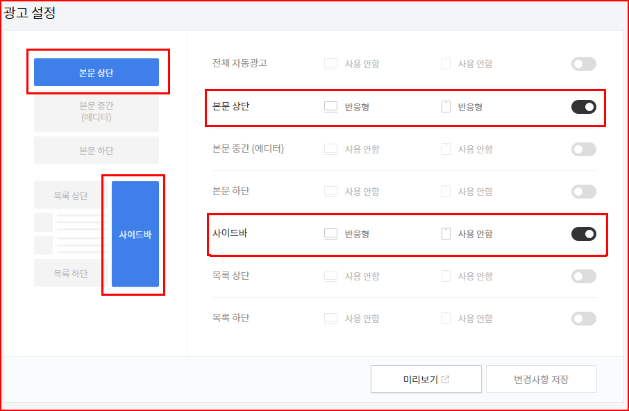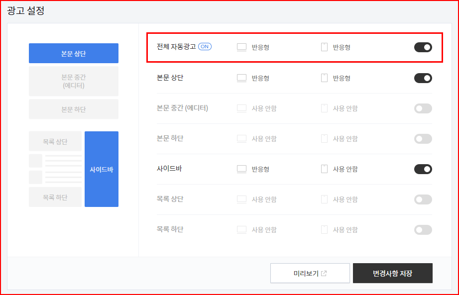[전체자동광고]를 선택한 경우는 [전체자동광고] 옆에 (ON)이라는 표식이 뜹니다. 물론 자동광고로 지정하면서도 본문상단과 사이드바 옵션 선택도 가능하군요. 저는 [전체자동광고]를 선택하지 않고 구체적으로 본문상단과 사이드바를 지정해서 변경사항을 저장했습니다.