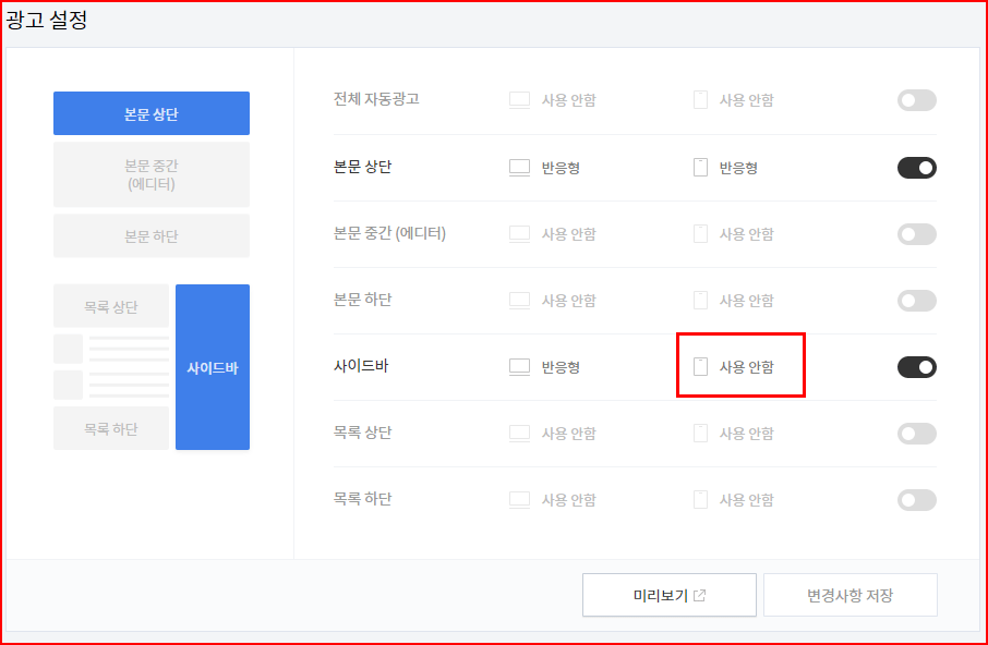 구글애드센스에는 본문상단과 사이드바를 선택했습니다. 사이드바 광고는 모바일에서는 사용할 수 없습니다. 화면 크기 때문에 사이드바가 나타날 수 없기 때문입니다. 그러므로 사이드바는 컴퓨터에서만 사용된다는 것이 위 설정창에서도 확인됩니다.