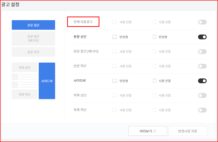 이와 같이 광고 게재 위치등을 지정할 수 있습니다. 물론 [전체자동광고]를 선택하여 임의적으로 광고가 게재되게 할 수 있습니다.