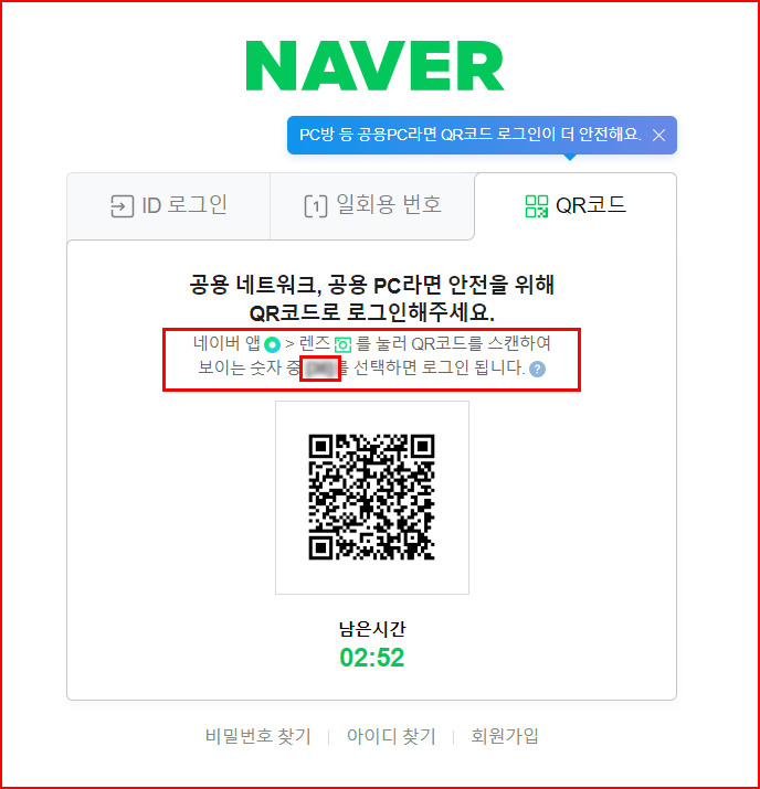 PC 네이버로그인창에 나온 숫자를 맞춰주면 됩니다. 숫자는 QR로그인을 시도할 때마다 달라지는 임시 암호인 셈입니다. 이런 식으로 공용PC에서 원격로그인을 하면 보안상 안전합니다.