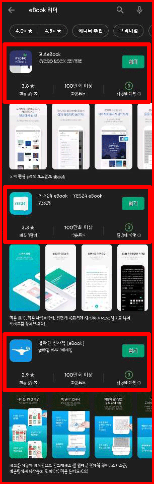 eBook리더기는 여러 곳에서 제공하고 있습니다. 교보, 예스 24, 알라딘 전자책 등이 있습니다. 전부 100만 다운로드를 달성한 검증된 어플입니다. 그중 알라딘을 사용하는 것은 비교적 PDF 파일에 친화적입니다.