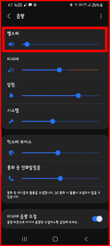 어떤 사연인지는 모르겠으나 아래 표처럼 벨소리가 낮춰진 경우 볼륨을 제아무리 키워도 벨소리는 들리지 않습니다. 오른쪽 이미지처럼 3/4 이상 되어야 벨소리가 정상적으로 들립니다. 너무 크면 주위 사람들이 놀라니까 이 정도가 괞찮지 싶어요.