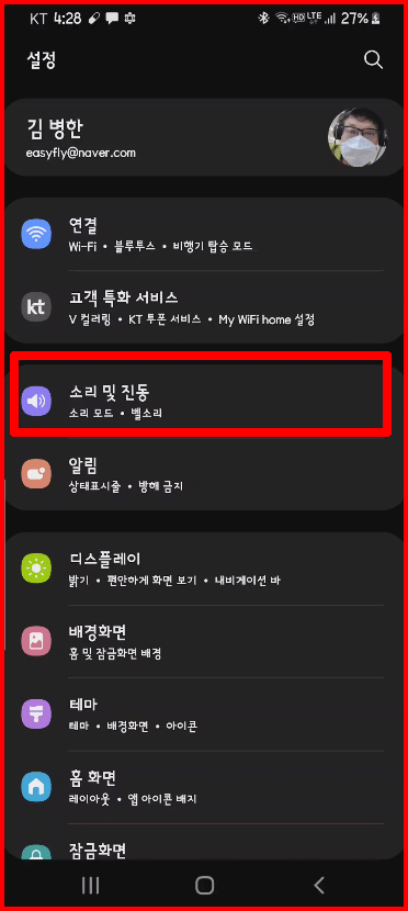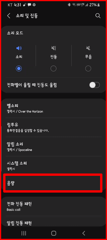 스마트폰의 설정에는 여러 가지 환경을 정합니다. 그 가운데 [소리 및 진동]이 있습니다. [소리 및 진동] 메뉴에는 벨소리 등 알림 소리 설정 등이 있는데, 위에서 다섯 번째에 [음량]이 있습니다. 이곳에서 각 분야별 음의 크기를 조절합니다.