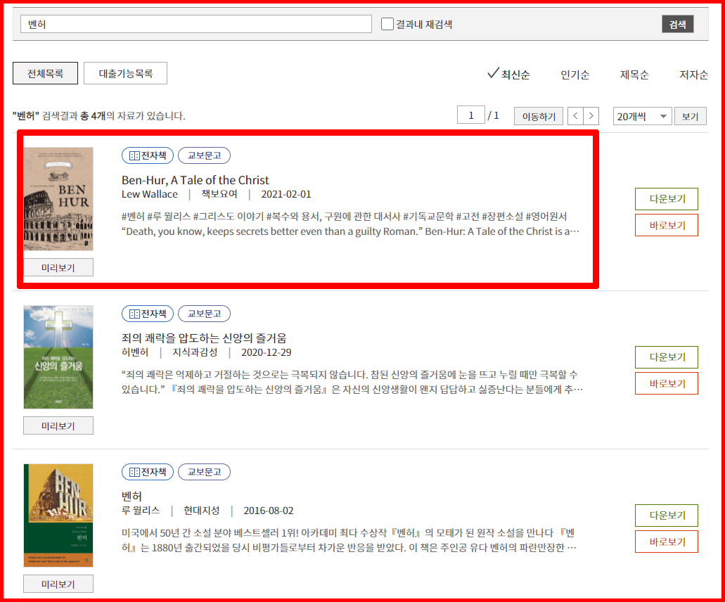 검색된 결과는 4권입니다. 그중 하나는 저자가 '허벤허' 목사님이라 검색된 책이고, 나머지는 소설 '벤허'가 맞습니다. 첫 번째로 올라온 도서가 영문판이군요. 오른쪽에 [다운보기]와 [바로보기]가 있습니다.
