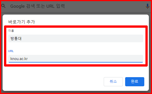 이름은 '방통대', 주소는 'knou.ac.kr'을 입력하고 '완료'를 클릭합니다.